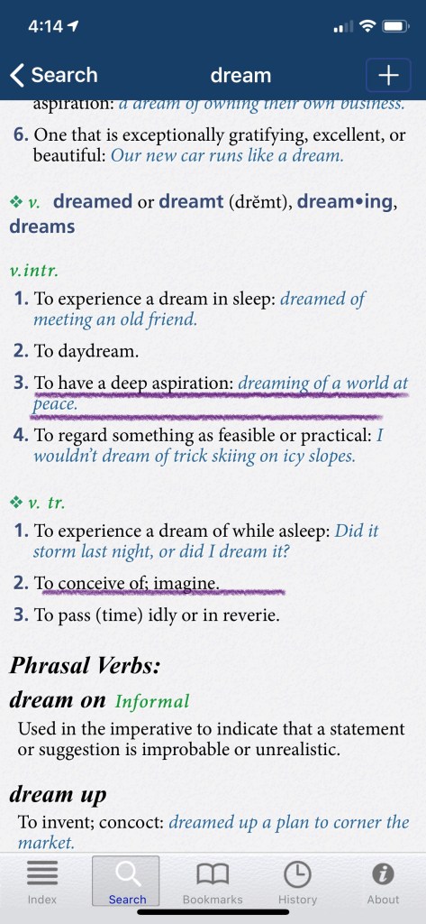 - The American Heritage Dictionary (4th ed.) defines the transitive verb form of the word dream as “to conceive of or imagine.”